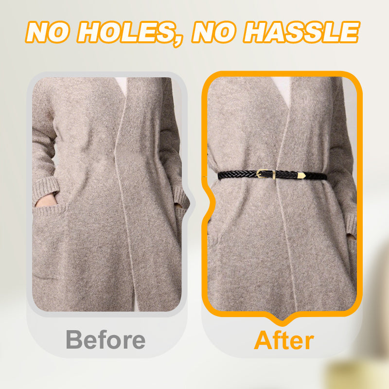 BEZ OTWORÓW, BEZ PROBLEMÓW — innowacyjny splot pozwala zapiąć pasek w dowolnym miejscu na całej jego długości. Eliminuje to konieczność stosowania gotowych otworów, zapewniając pełną elastyczność stylizacji i idealne dopasowanie do każdego stroju.